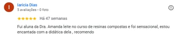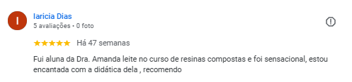 A Amanda Presoti foi aluna da 1° Turma da Imersão de Resina composta em dentes anteriores ministrado pela Dra. Amanda Leite. Ainda em graduação, Amanda enxergou e aproveitou essa oportunidade da imersão poder dar um direcionamento ao se formar. Hoje, já formada, Amanda colhe os frutos de um aprendizado bem aproveitado, aplicando técnicas e conhecimentos fundamentais para um resultado de excelência com as resinas compostas.